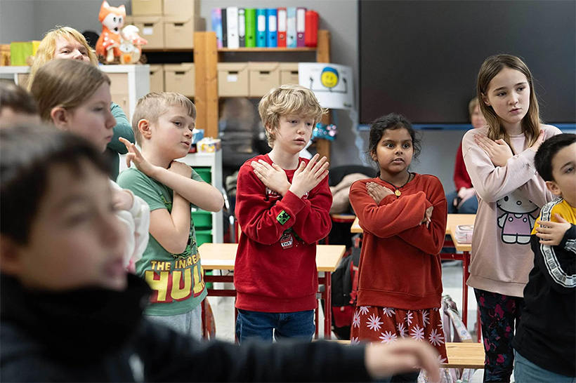 Und wo könnte man ihn besser kennenlernen als bei einer Probe? Die ist immer montags, die Zweitklässler kommen nacheinander in zwei Gruppen. Chorleiterin Mariola Jupé, sie ist ausgebildete Opernsängerin, hilft ihnen, den Zugang zur Musik zu finden. Auch zu Texten, obwohl Sprache ihnen manchmal Mühe macht. Deshalb: Lockerungsübungen, Stimmübungen und dann die ersten Texte. „Hallo Leute, wir sind da.“ Das klappt und macht den Acht- bis Zehnjährigen sichtlich Spaß.